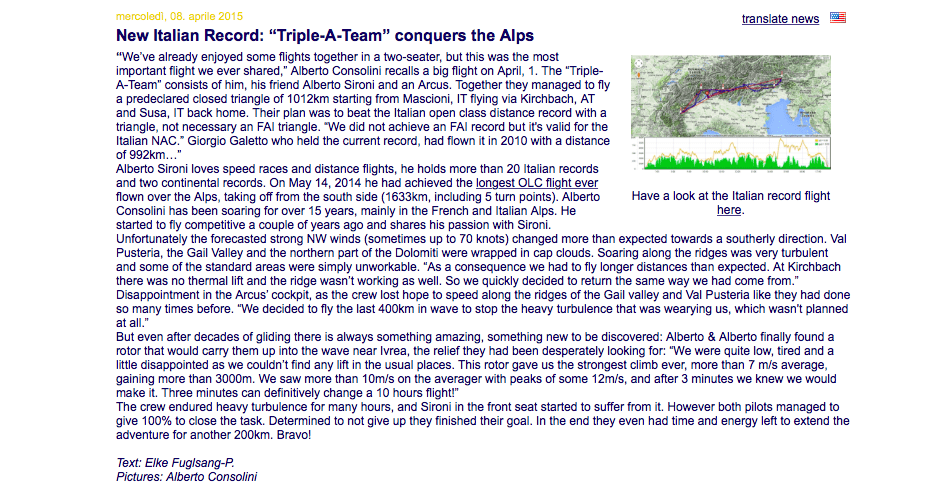 Un’altra impresa memorabile del nostro Alberto Sironi (Albertone) che, assieme ad Alberto Consolini (Albertino) e trainati da Alberto (Albertazzi), ha conquistato un altro record italiano di distanza su triangolo qualsiasi dichiarato Mascioni-Kirchbach-Susa-Mascioni, allungando poi di quasi 200 km dopo aver chiuso il tema. Il vento era molto forte e i nostri piloti hanno potuto […]