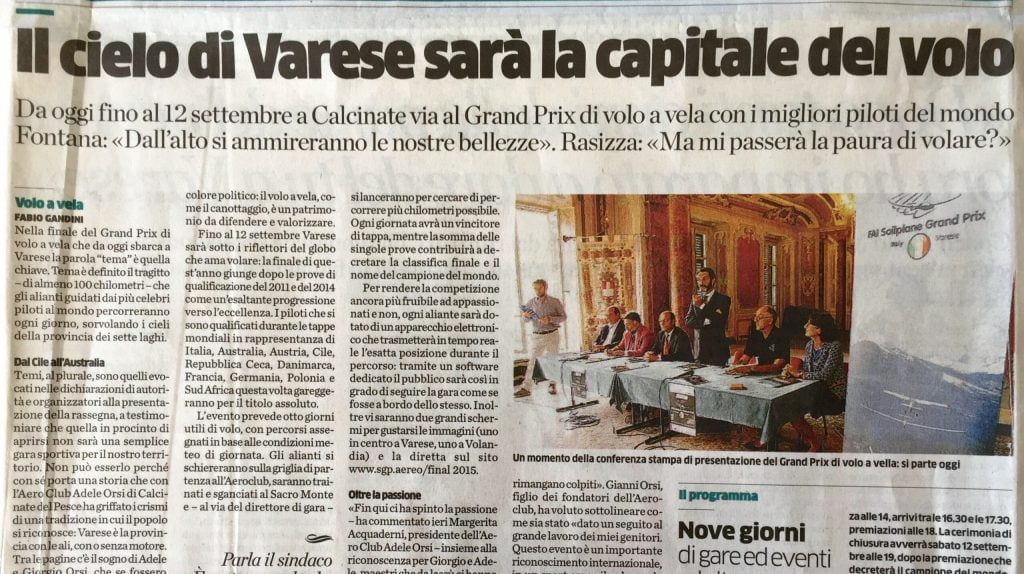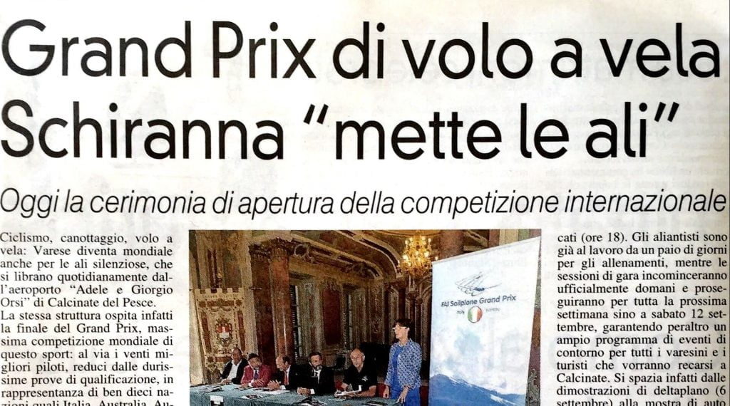 Questa mattina, nel Salone Estense del Municipio di Varese, si è tenuta la conferenza stampa di presentazione della finale mondiale del Grand Prix di Volo a Vela: il presidente dell’Aero Club Adele Orsi Margot Acquaderni e il Direttore di Gara Brian Spreckley si sono uniti al figlio dei fondatori del Club Gianni Orsi, al sindaco […]