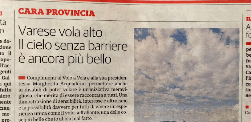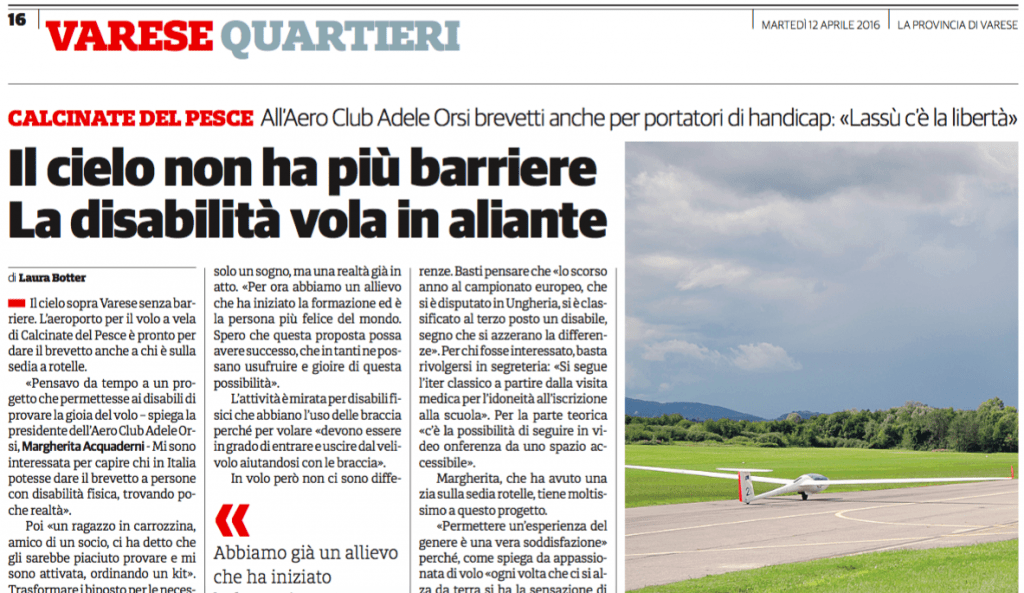 Da tempo l’ACAO si sta impegnando per rendere possibile l’esperienza del volo a vela anche alle persone con disabilità motorie, e questo progetto si sta ora finalmente concretizzando. Nelle prossime settimane il nostro aeroclub, in collaborazione con Spazio Vita Niguarda Coop Sociale Onlus, organizzerà infatti due incontri su questo tema. Il primo si svolgerà martedì […]