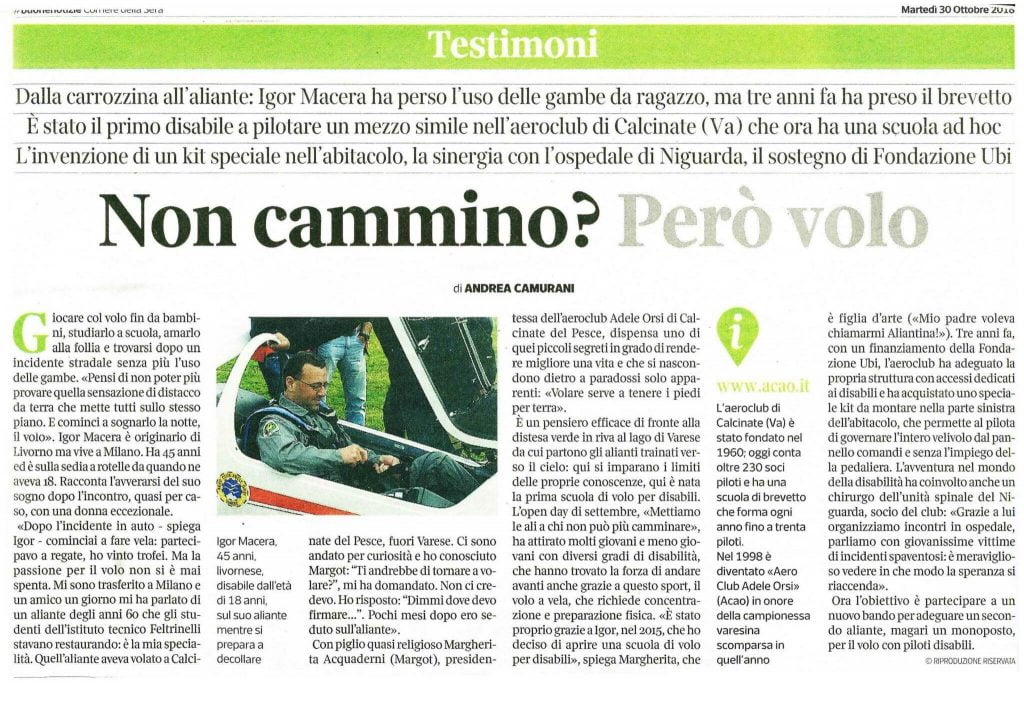 Lo scorso 30 ottobre il Corriere della Sera, nel suo inserto Buone Notizie, ha pubblicato un articolo dedicato al nostro socio Igor Macera e all’Aero Club Adele Orsi. Non possiamo che esserne orgogliosi!