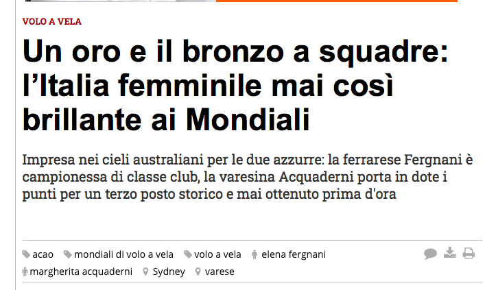 Un lavoro di squadra eccezionale! Sotto la guida ineguagliabile di un grande Campione, Riccardo Brigliadori, la squadra femminile formata da Elena Fergnani, pilota di Ferrara di 31 anni in classe Club e Margherita Acquaderni pilota ACAO in classe 18m, ha scritto una importantissima pagina della storia del volo a vela femminile, conquistando l’oro in […]